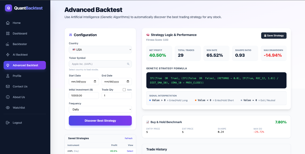 Use Artificial Intelligence (Genetic Algorithms) to automatically discover the best trading strategy for any stock. Our engine evolves profitable strategies by combining indicators and optimizing parameters for you.